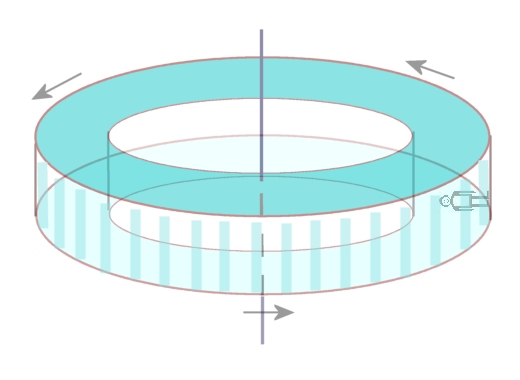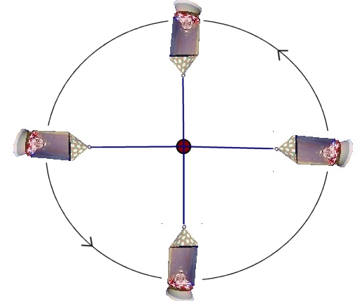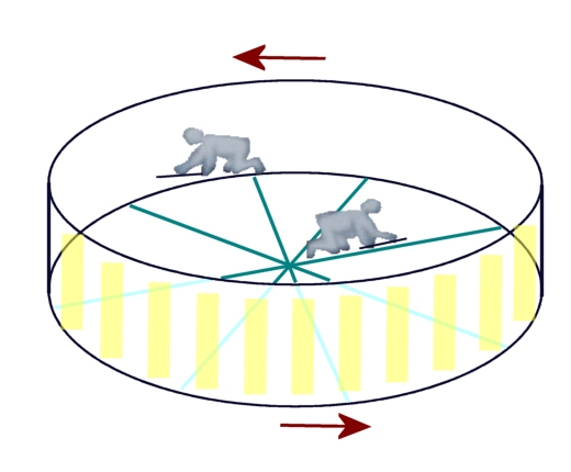 Per evitare danni ai muscoli e alle ossa degli astronauti indotti dalle lunghe permanenze in assenza di gravità, per viaggi spaziali in programma per il futuro, si pensa di creare all’interno delle astronavi una gravità artificiale come quella che Tonino sperimenta sulla giostra. Come fare? Semplice, come nel film “2001: odissea nello spazio“, basta far ruotare l’astronave intorno al proprio asse come nella figura che segue.