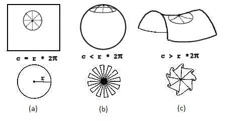Il rapporto tra circonferenza e raggio sarà inferiore a 6,28 nel caso (b) e maggiore di 6,28 nel caso (c).