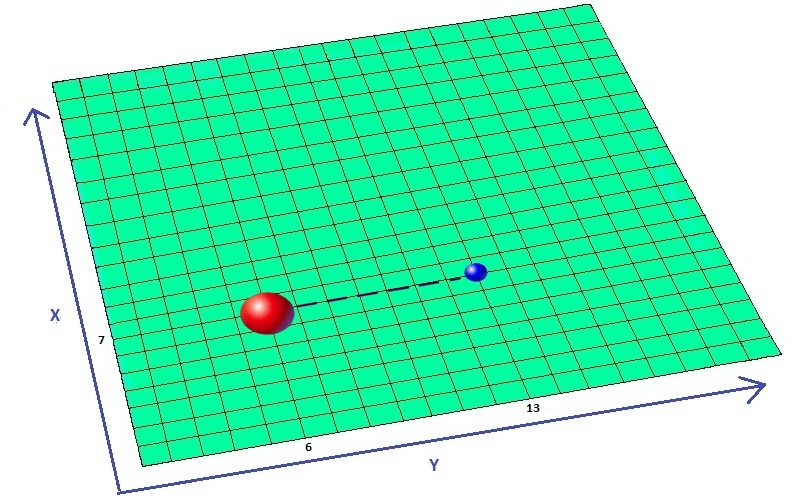 Nel disegno è raffigurata una porzione bidimensionale dello spazio. La griglia che ho disegnato è un modo efficace per specificare la posizione degli oggetti nello spazio. Per esempio, il corpo massiccio rosso è nella posizione 7,6; il corpo più piccolo azzurro è nella posizione 7,13.