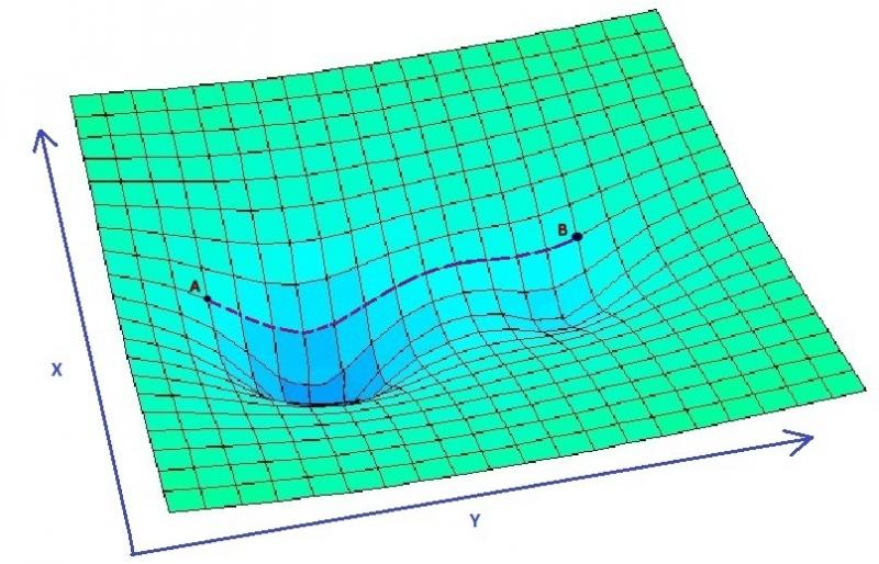 I due avvallamenti modificano la struttura dello spazio circostante e quindi le relazioni fisiche fra i punti. Abbiamo visto prima che, in uno spazio piatto, la strada più breve tra due punti A e B è una linea retta. Che cosa succede quando lo spazio diventa curvo? Come puoi vedere dalla figura, la traiettoria più breve fra due i punti A e B su uno spazio curvo non è più una linea retta ma una particolare curva che è chiamata ‘geodetica’.