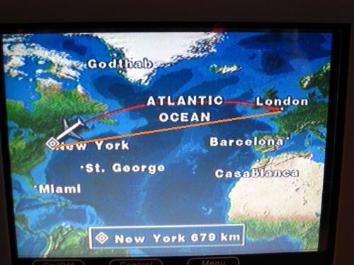 Ti potrà sembrare strano ma la rotta più breve fra Londra e New York non è la linea arancione. Per andare a New York, l’aereo va prima verso nord raggiungendo quasi la Groenlandia, poi curva verso sud sorvolando il Canada. In pratica segue la geodetica rappresentata dalla curva rossa.