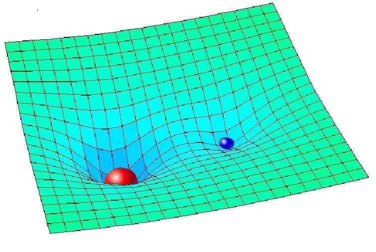 Secondo un’analogia assai sfruttata ma molto utile, lo spazio è come una membrana di gomma su cui viene posata una palla pesante. Più è pesante la palla, più profondo è l’avvallamento. A questo punto, la superficie della membrana non è più una superficie piana ma una superficie irregolare che influenza il moto delle palline che dovessero scorrerci sopra. Se per esempio prendo la palla piccola azzurra e la lascio andare a una certa velocità verso sinistra, il percorso che essa seguirà la porterà a cadere nell’avvallamento della palla rossa. Se invece la spingo con la giusta velocità verso l’alto e verso sinistra, la palla azzurra rotolerà lungo il bordo dell’avvallamento prodotto dalla palla rossa. Anche nello spazio curvo succede la stessa cosa: i corpi celesti in movimento nelle vicinanze di un incurvamento dello spazio causato dalla massa di un grande corpo celeste come il Sole sono costretti a percorrere uno spazio modificato. Nel caso del pianeta Terra che gira intorno al Sole accade proprio questo: la velocità e la posizione della Terra rispetto al Sole sono tali che la Terra, in assenza di attriti, orbita attorno al Sole rotolando sul bordo dell’avvallamento dello spazio causato da quest’ultimo. Non c’è alcun motivo di ipotizzare una forza di attrazione gravitazionale da parte del Sole!