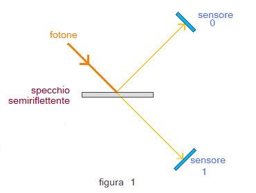 Cosa succede se si invia verso lo specchio un raggio che contiene un solo fotone? Il fotone è una particella che, per la teoria dei quanti, si ritiene indivisibile per cui non è possibile avere mezzo fotone sul sensore 0 e mezzo fotone sul sensore 1. Dove si dirigerà il fotone? Verso il sensore 0 o verso il sensore 1? Non è possibile prevederlo. Il fotone, incontrando lo specchio sulla sua strada, decide in quale direzione andare in modo assolutamente casuale. Se si ripete però l’esperimento per un certo numero di volte si vedrà che metà dei fotoni va verso il sensore 0 e l’altra metà va verso il sensore 1.