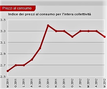L’ISTAT, Istituto nazionale di statistica, pubblica mensilmente l’indice dei prezzi al consumo o indice di inflazione. Guardando il grafico a fianco, si vede che i prezzi al consumo nel febbraio 2012 sono cresciuti del 3.3 per cento su base annua.