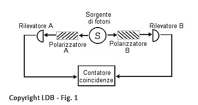 Ogni fotone incontra sulla sua strada un polarizzatore, che, in base all’orientamento impostato dallo sperimentatore, permette o meno il passaggio del fotone sul rilevatore di fotoni. Il rilevatore di fotoni è in grado di registrare un +1 o un -1 a seconda che il fotone riesce a passare o meno attraverso il polarizzatore. Per esempio, se il polarizzatore è disposto verticalmente, un fotone polarizzato verticalmente passerà e sarà registrato sul contatore di coincidenze con un bel +1, mentre un fotone polarizzato orizzontalmente sarà bloccato e registrato come -1. I segnali che emergono dal canale di sinistra, rilevatore A, e da quello di destra, rilevatore B, sono controllati e le coincidenze (+1,+1 e -1,-1) sono conteggiate dal contatore di coincidenze.