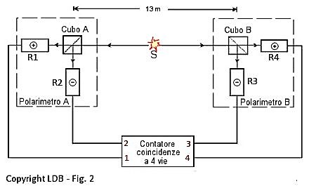 In questa configurazione, il fotone che sbatte contro lo specchio semiriflettente del cubo A deve per forza di cose essere registrato da uno dei due rilevatori del polarimetro A. Se non viene registrato né da R1 né da R2, vuol dire che uno dei due rilevatori si è ‘perso’ il fotone e, conseguentemente, la manche dell’esperimento non viene considerata.