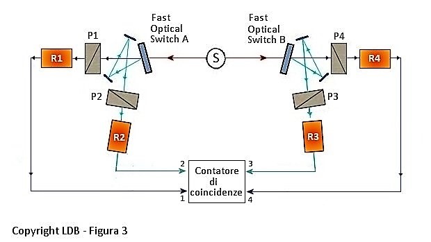 I due Switch commutano ogni 10 ns indipendentemente uno dall’altro e in modalità ‘random‘. Ora, conoscendo la distanza tra la sorgente e lo Switch ‘A’ (6 metri) e la velocità della luce (300.000 km/s) sappiamo che il tempo che impiega il fotone per coprire la distanza Sorgente-Switch è di 20 ns. Quindi, mentre il fotone viaggia per 20 ns, lo Switch ‘A’ commuta casualmente fra le due posizioni ogni 10 ns. Quale sarà l’orientamento dello Switch quando il fotone lo raggiungerà? Non è dato saperlo fin a quanto il fotone non investe lo Switch. Con tutte le buone intenzioni, la sorgente non può in alcun modo informare il fotone circa il setup dell’esperimento con messaggi locali.