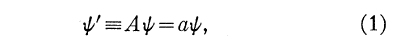 | The fundamental concept of the theory is the concept of state, which is supposed to be completely characterized by the wave function Ψ which is a function of the variables chosen to describe the particle’s behavior. Corresponding to each physically observable quantity A there is an operator, which may be designated by the same letter. If Ψ is an eigenfunction of the operator A, that is, if | Il concetto fondamentale della teoria è il concetto di ‘stato’, che si suppone sia completamente definito dalla funzione d’onda Ψ, che è funzione delle variabili scelte per descrivere il comportamento della particella. Per ogni quantità fisica osservabile A (per esempio, il momento) c’è un operatore che può essere designato con la stessa lettera ‘a’. Se Ψ è la funzione propria dell’operatore A dove, se |