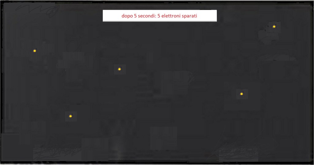 Invece di sparare un centinaio di migliaia di elettroni quasi contemporaneamente è possibile spararne uno al secondo. In questo modo è possibile vedere dove va sbattere il singolo elettrone. Dopo 5 secondi, dopo avere sparato 5 elettroni, facciamo una foto della piastra di rilevamento.