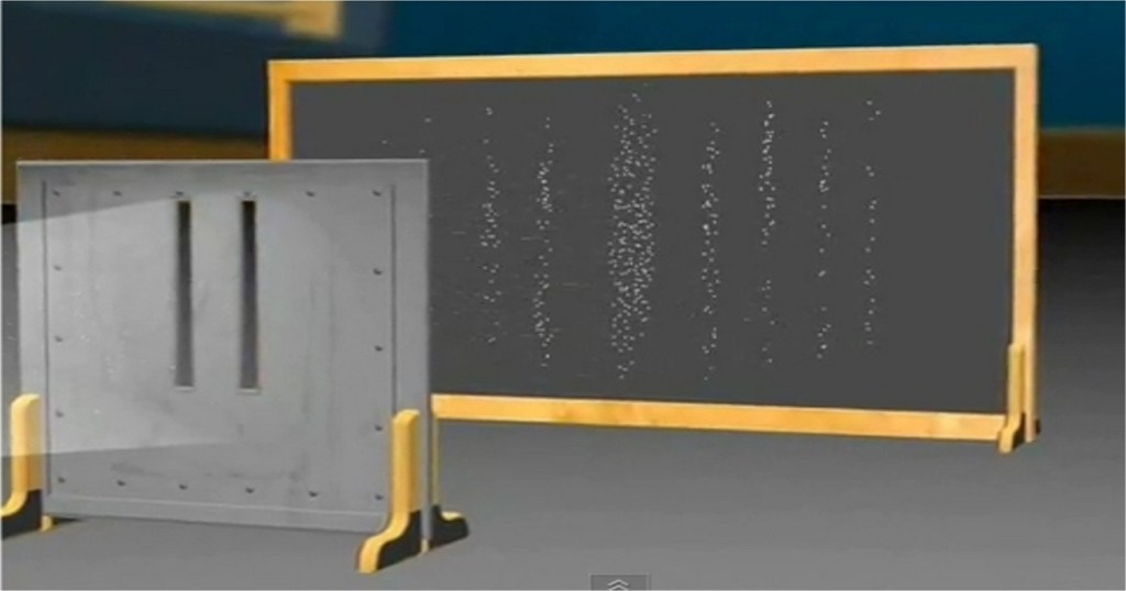 Nell’esperimento, un fascio di elettroni viene ‘sparato’ contro uno schermo con due fenditure. Al di là dello schermo, sulla piastra di rilevamento, gli elettroni lasciano una traccia ben visibile del punto di impatto. Dopo avere ‘sparato’ un centinaia di migliaia di elettroni, sulla piastra di rilevamento troveremo la caratteristica figura di interferenza con bande chiare alternate a bande scure come nella figura.