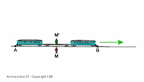 Nel primo frame dell’animazione ci sono i nostri due amici Rossi e Verdi. Rossi è su un terrapieno di lato a una linea ferroviaria nel punto M. Verdi, invece, si trova sul treno nella posizione centrale M’. Il treno viaggia a velocità pazzesca da sinistra verso destra.