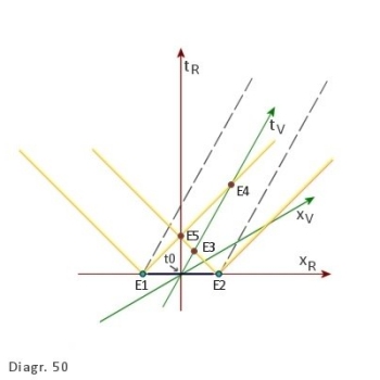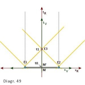 Nel diagramma 49 c’è il treno nel sistema di riferimento verde con il signor Verdi posto al centro del treno in posizione xV = 0 (punto M’ nell’esperimento mentale). Sul terrapieno, sistema di riferimento rosso, c’è il signor Rossi in posizione xR = 0 (punto M).
