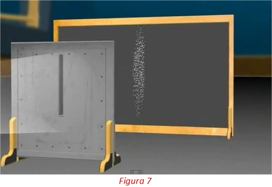 Quelle che centrano la fenditura passano oltre lo schermo, colpiscono la lastra di rilevamento lasciando un’impronta nel punto d’impatto.