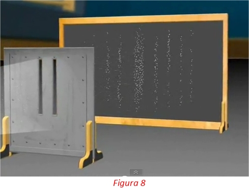 (1) gli elettroni in un flusso sparato contro una singola fenditura (figura 7) si comportano come particelle; (2) gli elettroni in un flusso sparato contro due fenditure (figura 8) si comportano come onde; (3) un elettrone sparato singolarmente contro una singola fenditura (figura 9) si comporta come una particella; (4) più elettroni sparati singolarmente contro due fenditure si comportano come onde.