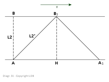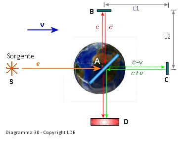 La situazione verso lo specchio C è diversa. La distanza tra A e C rimane sempre costante e uguale a L1. La velocità del raggio è c – v all’andata e c + v al ritorno, per cui la velocità media sul percorso A-C-A è sempre c.