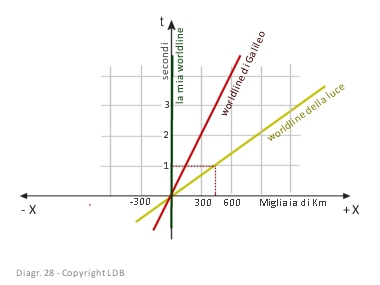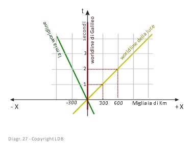 Come vedi, nel diagramma 27 , ho graduato l’asse dello spazio (x) in migliaia di chilometri e l’asse del tempo (t) in secondi.