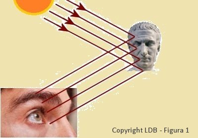 Se io guardo un oggetto come il busto di marmo di Giulio Cesare, il mio occhio percepisce un fascio di raggi di luce che, generato da una sorgente S (che può essere il Sole o una lampadina accesa) rimbalza sulla superficie del marmo e viene riflesso verso il mio occhio. Tutto semplice fin qui.
