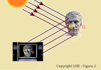 Primo: sulla pellicola è registrata un’immagine facilmente riconoscibile, anche se in negativo, del busto di Giulio Cesare. Secondo: ciascun punto sulla pellicola corrisponde a un punto sulla struttura illuminata. Per esempio, la punta del naso sulla pellicola, punto N, corrisponde alla punta del naso del busto, punto M; la punta dell’orecchio sinistro sulla pellicola, punto P, corrisponde alla punta dell’orecchio sinistro del busto, punto Q. In pratica, fra l’immagine registrata e la struttura illuminata c’è un rapporto di uno a uno.