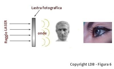 Infatti, se il fascio di luce coerente di un raggio laser investe la lastra, io, che mi trovo sul lato opposto rispetto alla sorgente di luce, vedo una sbalorditiva ‘immagine’ tridimensionale del busto di Giulio Cesare sospesa nel vuoto. L’occhio che ho messo in figura 6 non è il mio occhio. Ci tengo a precisarlo nel caso ti venga di pensare che io abbia l’abitudine di truccarmi gli occhi.