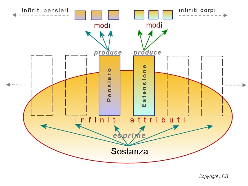 Negli esempi fatti finora ho parlato solo dell’attributo estensione. Ce ne sono altri? In effetti ce n’è un numero infinito ma quelli che ci competono sono solo due: quello dell’estensione e quello del pensiero. L’attributo pensiero si esprime nei modi del pensiero sotto forma di singoli pensieri, emozioni, sentimenti, atti di volontà, decisioni, ecc.