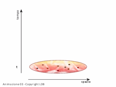 Nell’animazione 03, l’ellisse rappresenta il cervello con le sue mappe neurali. Nella nostra esperienza tridimensionale viene spontaneo pensare che il cervello o, meglio, le sue mappe neurali si modifichino nel tempo. Si pensa che la configurazione di neuroni e sinapsi al tempo t svanisca velocemente nel nulla e si trasformi nella configurazione del tempo t+1 … e via di questo passo.