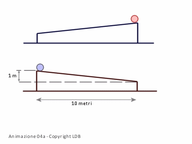 Nell’animazione 04 ci sono 2 piani inclinati perfettamente uguali con una pendenza del 10% (per ogni 10 metri in orizzontale c’è 1 metro di dislivello.) La palla rossa è di alluminio e pesa 1 chilo. La palla blu è di piombo e pesa 10 chili.